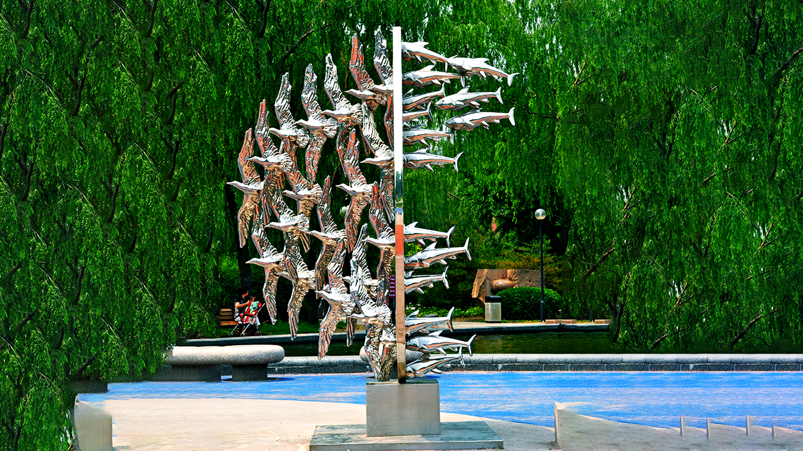 在城市广场、公园、校园等公共空间,不锈钢雕塑已成为不可或缺的文化符号。其耐腐蚀、易维护的特性,使其能长期适应户外复杂环境;而现代感的造型与金属光泽,又能与钢筋水泥的城市建筑形成和谐对话。北京奥林匹克公园的 “鸟巢” 配套雕塑、上海外滩的金属艺术装置,均以不锈钢为材质,既展现了城市的时代精神,也为公众提供了感知艺术、互动交流的载体,让艺术走出美术馆,融入日常生活。